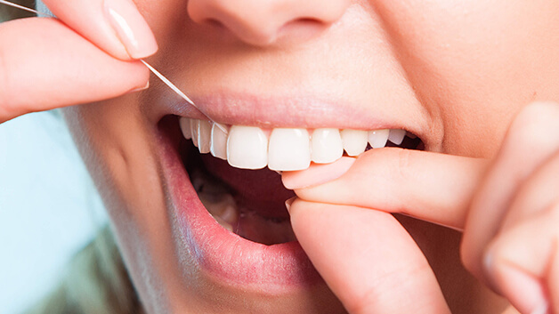 • сначала необходимо очистить стык протеза с десной, тщательно орудуя зубной нитью с небольшим количеством пасты, движения должны иметь форму восьмерки;